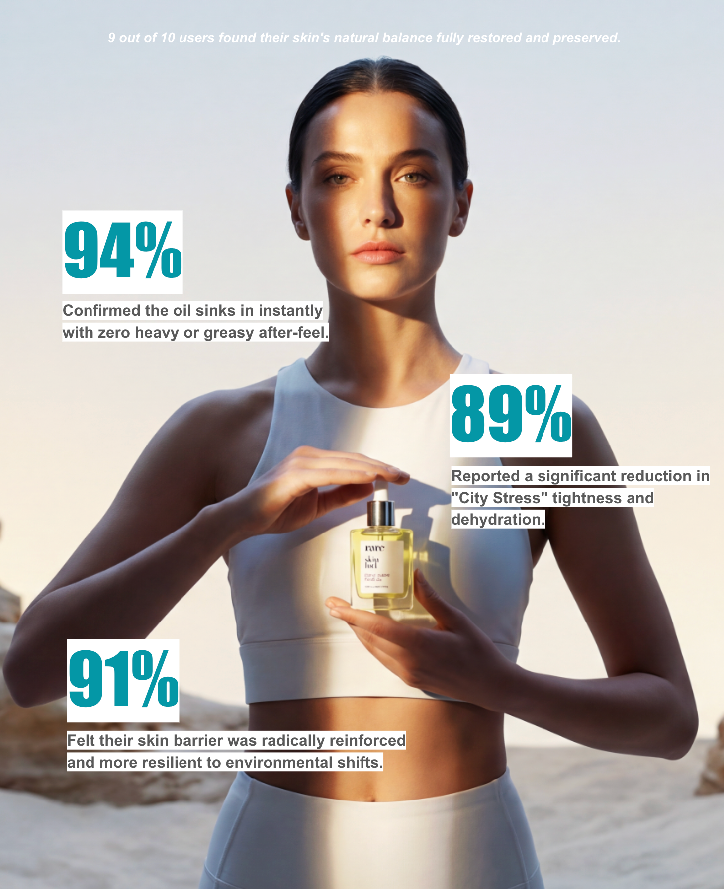 The only botanical oil molecularly identical to human sebum, allowing it to "trick" the skin into deep absorption while balancing natural oil production. It creates a breathable, non-clogging barrier that restores suppleness and prevents "City Stress" dehydration.