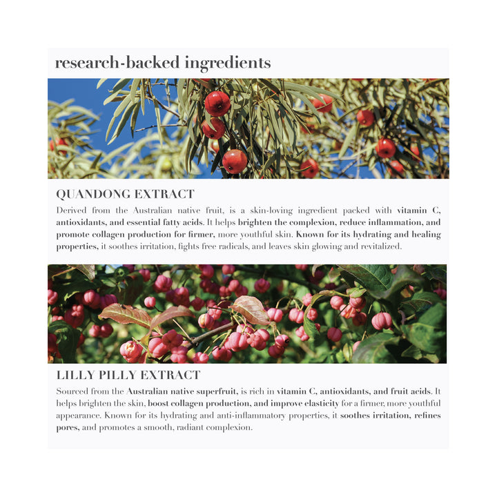 Yes, it’s perfect for oily or acne-prone skin! Ingredients like Quandong Extract and Lilly Pilly Extract are packed with antioxidants and natural antibacterial properties, helping to purify your skin, regulate oil production, and prevent breakouts without over-drying.